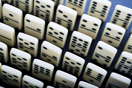 Male and female hands placing wooden blocks with contact and communication icons on; them in a row. Wide view image over blue background.