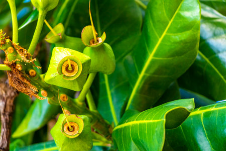 Beautiful tropical garden plant plants tree flower leaf leaves in green white and yellow colors pattern in Patong Beach Kathu Phuket Island Southern Thailand in Southeast Asia.