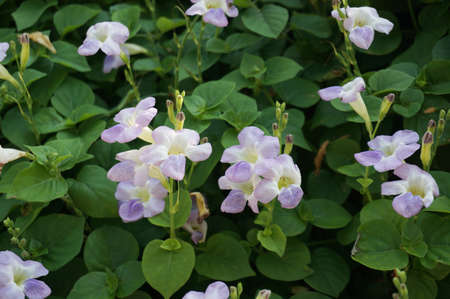 Photo of purple Ganges Primrose flower, Ganges River asystacia, Creeping foxglove ( Asystasia gangetica (L.) T.Anderson. ) and green leaves in a garden, Close up