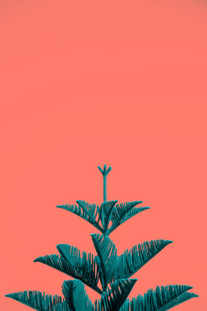 The top part of a Norfolk Island Pine tree (Araucaria heterophylla), in a minimal style, standing against peach color background.