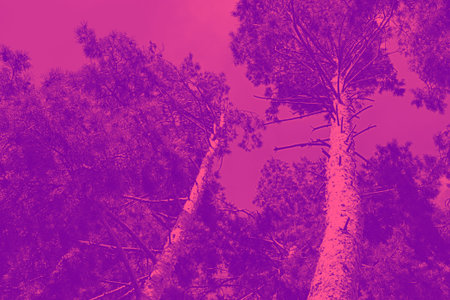 Crowns of trees against the sky on a spring day. Natural background pink color toned with copy space