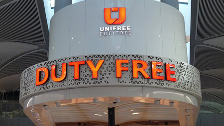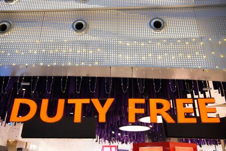 Istanbul, Turkey - May 7, 2019: the sign of Duty Free area in new Istanbul International Airport, Istanbul Yeni Havalimani for Turkish Airlines, close up.