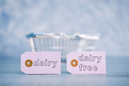 dairy vs dairy-free product tags with shopping basket, concept of plant-based food or allergies and nutritional choices