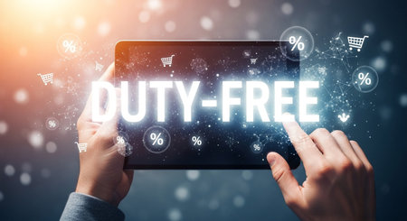 A person holds a tablet displaying DUTY-FREE surrounded by discount and shopping cart icons, symbolizing tax-exempt shopping and online retail opportunities.