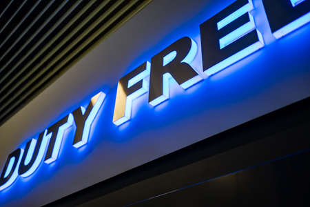 sign with illumination of the duty-free goods store at the airport.