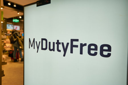 MUNICH, GERMANY - CIRCA JANUARY, 2020: close up shot of MyDutyFree sign seen in Munich Airport.