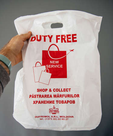 Paris, France - April 28, 2018: Man holding against gray background plastic package from Moldovan Duty Free Dufremol S.A with the new Shop and collect feature advertisided