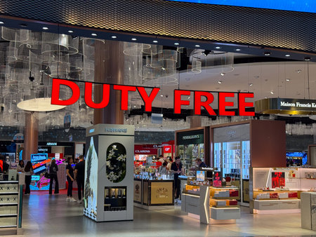 ISTANBUL, TURKEY - AUGUST 3, 2025: Close view of duty free cosmetics shop inside Istanbul airport terminal. International travel retail, luxury consumption, brand presentation, passenger shopping experience, and modern airport commercial environment