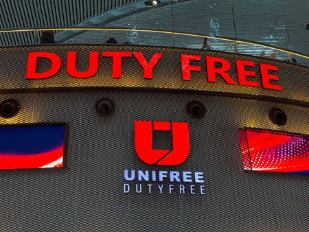 ISTANBUL, TURKEY - AUGUST 3, 2025: Wide view of Unifree duty free signage inside Istanbul airport terminal. International retail branding, travel commerce orientation, airport shopping navigation, global consumer environment, and modern aviation infrastru