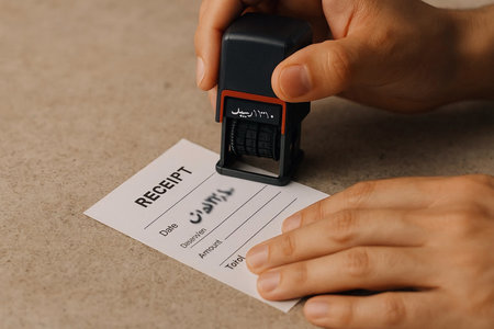 A male hand holds a wooden rubber stamp and presses it onto a paper document to leave a red approved mark while a digital green check mark glows brightly above the stamping action.