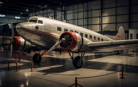 A stunning vintage aircraft positioned in a sunlit hangar, showcasing dramatic lighting and shadows. Perfect for themes of aviation and nostalgia.