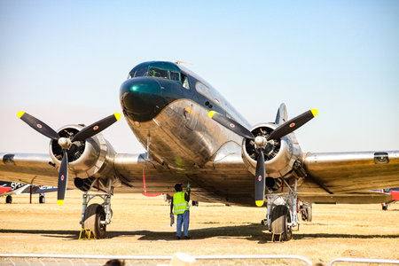 Johannesburg, South Africa - May 22, 2011: Old-school vintage propeller aircraft parked on airport tarmac being checked by mechanic in pre-flight maintenance