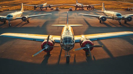 Retro airplanes stand in a row on an airfield during sunset, highlighting their vintage design against a vibrant horizon.