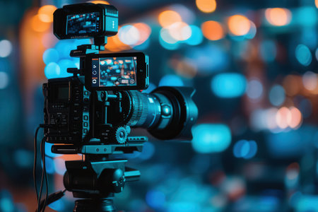 A professional camera with a strong lens is set up to capture dynamic footage. The background of vibrant lights adds a sense of excitement and energy.