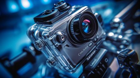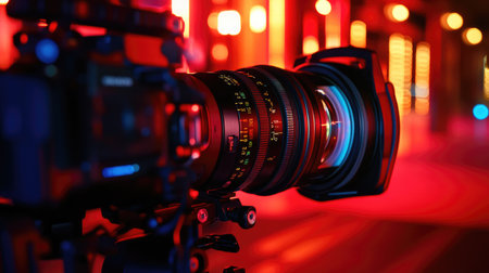 A close-up view presents a video camera, focusing on the lens and body. The scene is illuminated by dramatic blue and red lighting, creating a high-tech or cinematic atmosphere. It's suitable for illustrating media, technology, or production-related themes for diverse commercial uses.