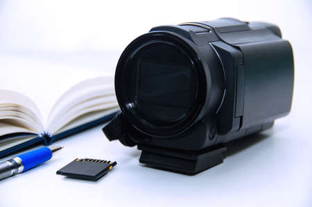 4K video camera with notebook pen and memory card on white background