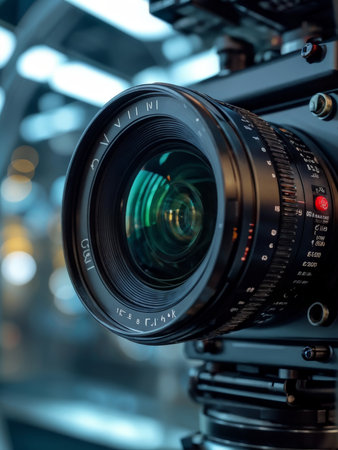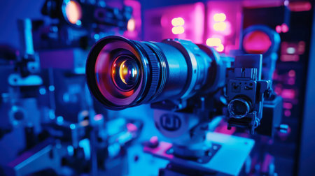 A detailed view of a camera lens positioned in a high-tech studio filled with colorful lighting. The intricate equipment reflects a contemporary atmosphere, highlighting the art of photography.