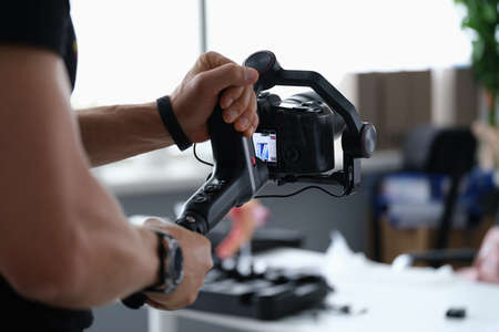 Hands of young videographer or photographer holding by handles on tripod on steadicam while shooting commercial in darkness