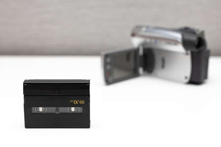 an old household video camera and a cassette for it lying nearby. high quality photo