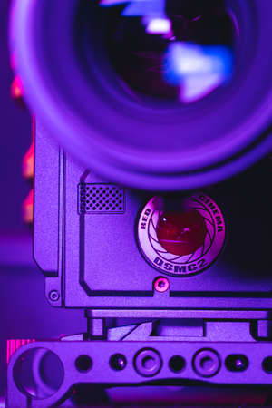 Kyiv, Ukraine - 04.17.2020: Studio shoot of professional 5k video camera Red DSMC2 with lens, close-up. Professional equipment for cinematographer, movie technology