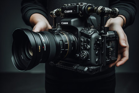 Photo camera in the hands of a man professional equipment hobby Creative approach studio cropped view