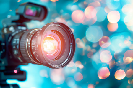 A stunning closeup view of a professional camera lens beautifully capturing vibrant bokeh lights, showing the intricate art of photography and creativity in action