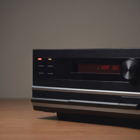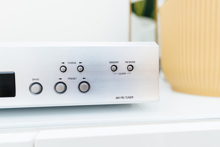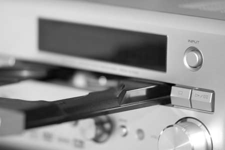 Modern Hi-Fi stereo amplifier tuner with CD tray open as seen from lateral low angle