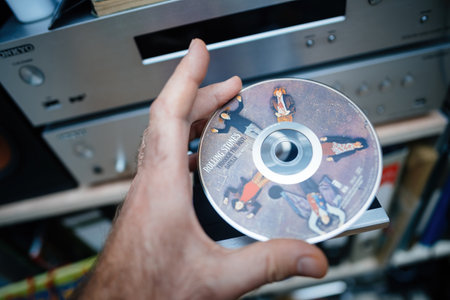Bonn, Germany - May 5, 2024: Hand inserting a Rolling Stones CD titled Through the Past, Darkly into a high-end stereo system, emphasizing music and audio equipment.