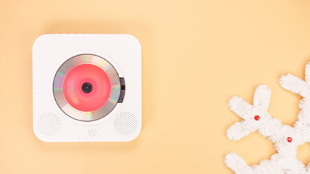 A vintage-inspired CD player isolated on a solid pastel background, complemented by a festive snowflake ornament. Modern and creative product photography, perfect for articles, web design, or mockup.