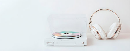 White headphones and CD player with a colorful disc on a minimalist white background.