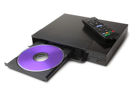 Blue Ray player with disk and remote control on white background