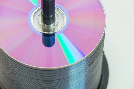 Many old CDs represent technology from the 90s. Stacks of CDs, old songs and old movies. which had been used before and placed on a white table. closeup, selective focus