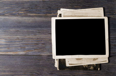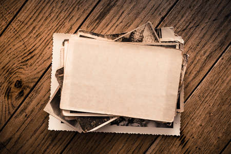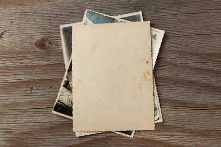 Stack old photos on table. Mock-up blank paper. Postcard rumpled and dirty vintage. Retro card
