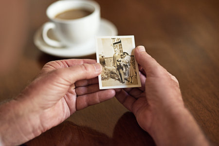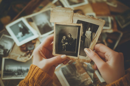 Warm tones highlight hands holding old photos, sparking nostalgia and a deep connection to cherished memories.