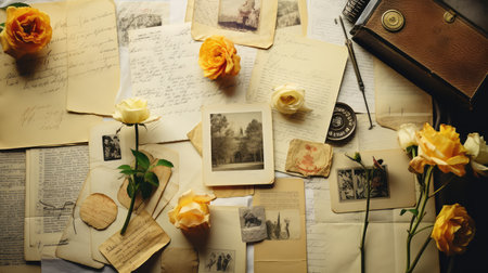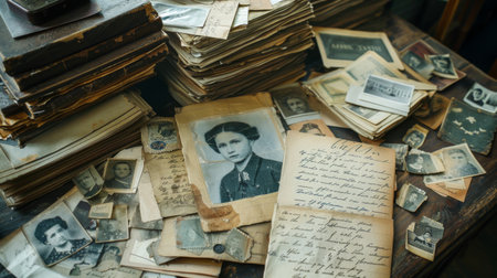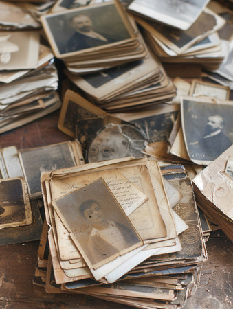 Old vintage photographs are scattered over a rustic antique table, evoking nostalgia and preserving memories of a bygone era in a charming setting.