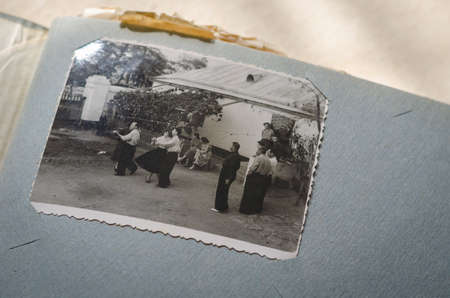 An old black and white photo in a family album. People dancing in pairs in the courtyard of a house. adult women, men and children.