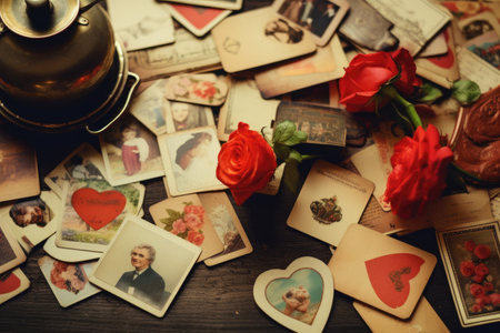 A table adorned with numerous pictures and a variety of colorful flowers, Vintage Valentine's Day postcards scattered on a wooden table, AI Generated