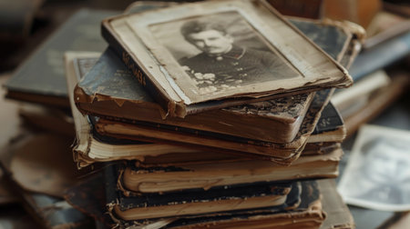 Old vintage photos on an antique table, surrounded by books, evoke nostalgia and timelessness for antique lovers.