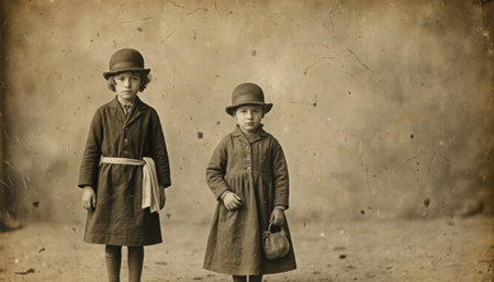 Vintage black and white portrait of two children with a concentrated expression on their faces. Sepia, aging effect, scuffs. The atmosphere of the past, retro style.