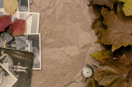 Old vintage photos of peoples with no faces, pocket watch and autumn foliage on crumpled paper page background with copy space. Photo frame design mockup.