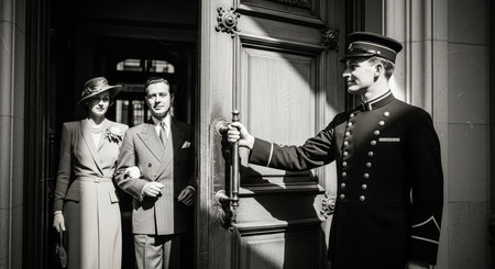 Elegant caucasian couple entering building with male doorman in vintage setting