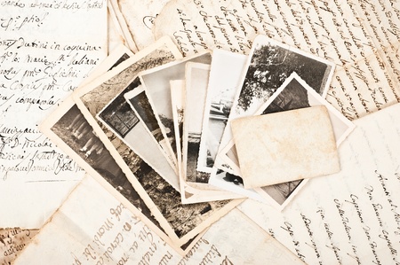 Family traditions, memore and nostalgia concept. Vintage photo frame and old photos on faily album on wooden board background.