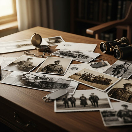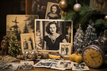 Old, vintage photographs rest on an antique table, creating a warm, nostalgic atmosphere perfect for antique shops or vintage studios.