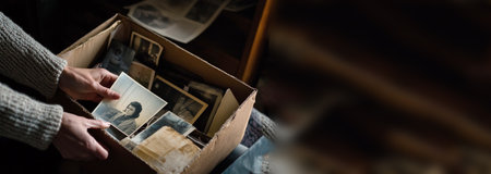 old photography box family memory. genealogy research old photos banner. vintage paper family history. nostalgia banner design.