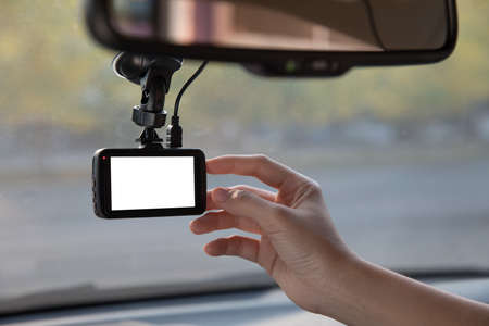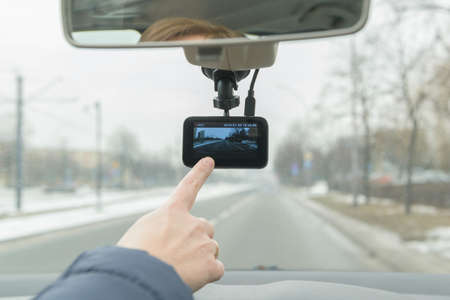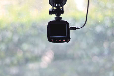 Many car dash cam (DVR) mounted on the dirty front windshield, recording the traffic ahead in case of an emergency situation or an accident