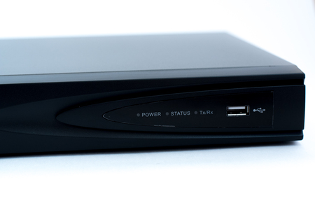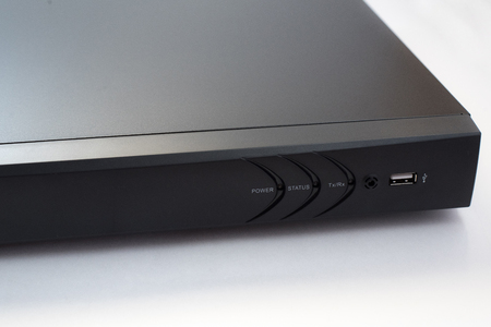 Modern white security cameras and video recorder close up. Video surveillance concept background.