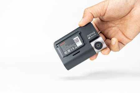 Pranburi Thailand-December 1,2021 :Xiaomi 70mai Dash cam 4k A800 on hand white background which can take 4k, support 24 hour parking surveillance and include advanced driver assist system.