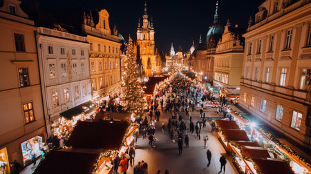 A bustling Christmas market in Prague at night, filled with people and illuminated stalls