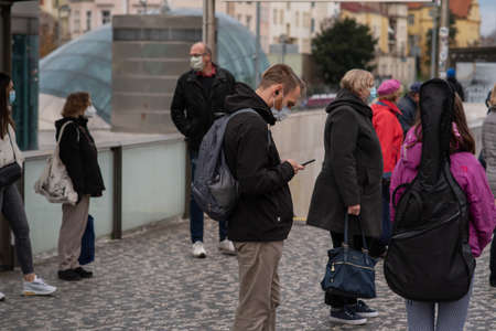 11-23-2020. Prague, Czech Republic. People walking and talking outside during coronavirus (COVID-19) at Hradcanska metro stop in Prague 6. Young man with mask.