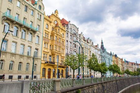 Prague embankment on a summer day. Panorama of the city. Beautiful buildings